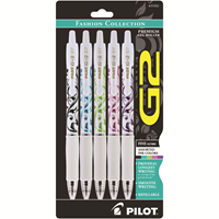 | Pilot G2 Retractable Fashion Gel Ink Pen .7 Fine 5pk Price: $10.955 count. Fine 0.7mm. G2 Retractable Fashion Collection Gel Ink Pen. Pens have white barrels with color designs in Black, Turquoise, Green, Pink and Purple. Colors on barrels match ink color.School Supplies: See more » | |