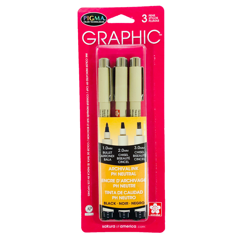 Pigma Graphic Pens, 3-Pen Black Ink Set (1.0mm (bullet), 2.0mm (chisel), 3.0mm (chisel)